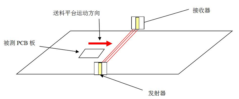 利用非接觸式影像測量技術(shù),通過一對高精度激光位移傳感器,包括一個接收裝置和一個發(fā)射裝置,當(dāng)覆銅板或PCB板經(jīng)過這對位移傳感器時,有板的地方將會阻擋發(fā)射裝置發(fā)射的信號,從而在接收裝置上無法響應(yīng)相應(yīng)位置的信號。