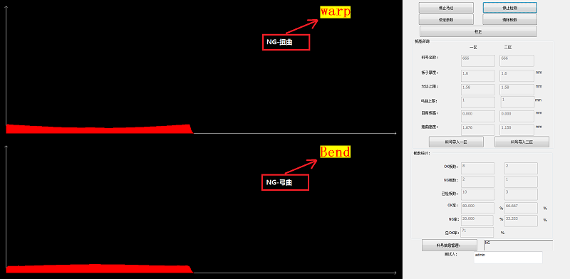 通過位置的信息可以得到PCB板的板厚曲線圖,通過特定軟件算法和翹曲度定義,計算出板翹曲度,并根據(jù)設(shè)定判斷條件得出OK和NG板。