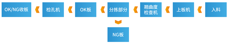 上板機(jī)+水平板翹反直機(jī)+板彎板翹檢查機(jī)+在線檢孔機(jī)+并聯(lián)機(jī)器人