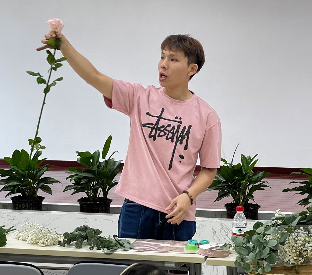 在老師的悉心指導下,大家大膽發(fā)揮自己的想象力,通過自己靈巧的雙手,將經(jīng)過修剪的多種花材,根據(jù)不同的色彩、形狀,有層次地搭配在一起。